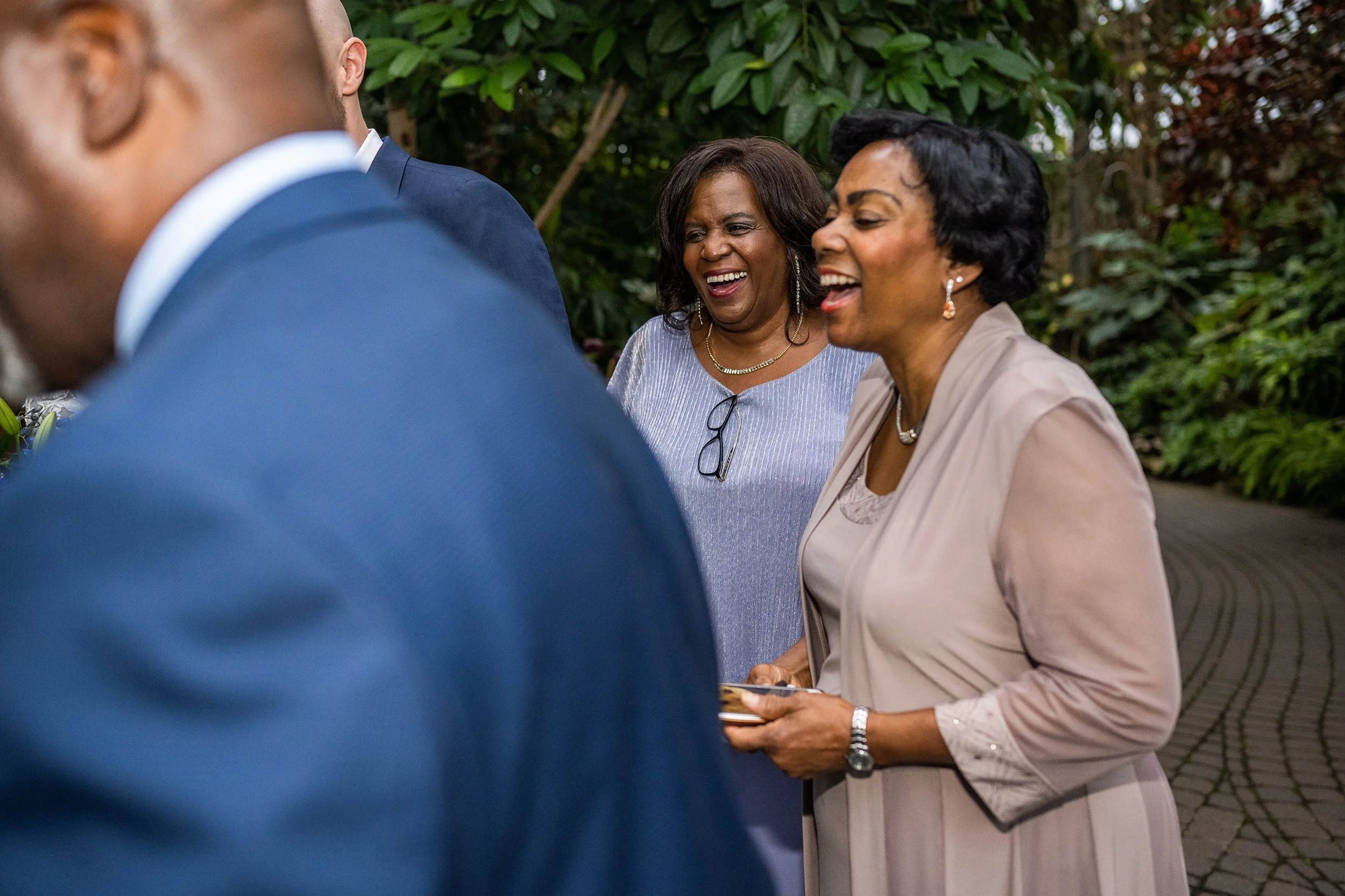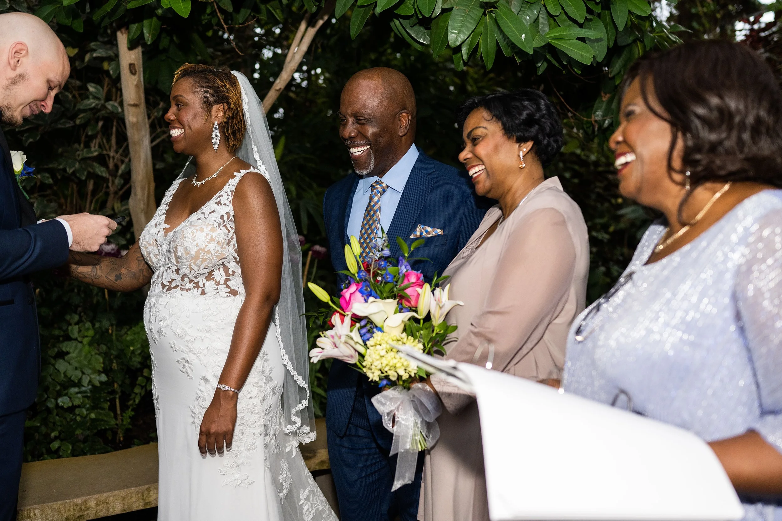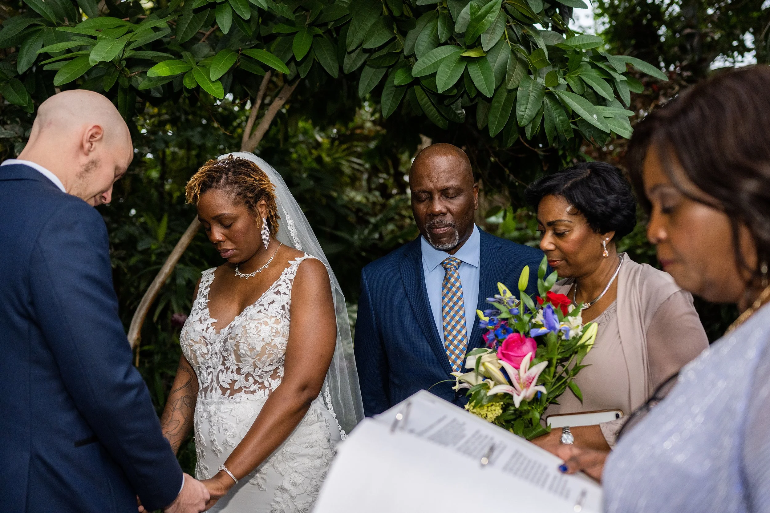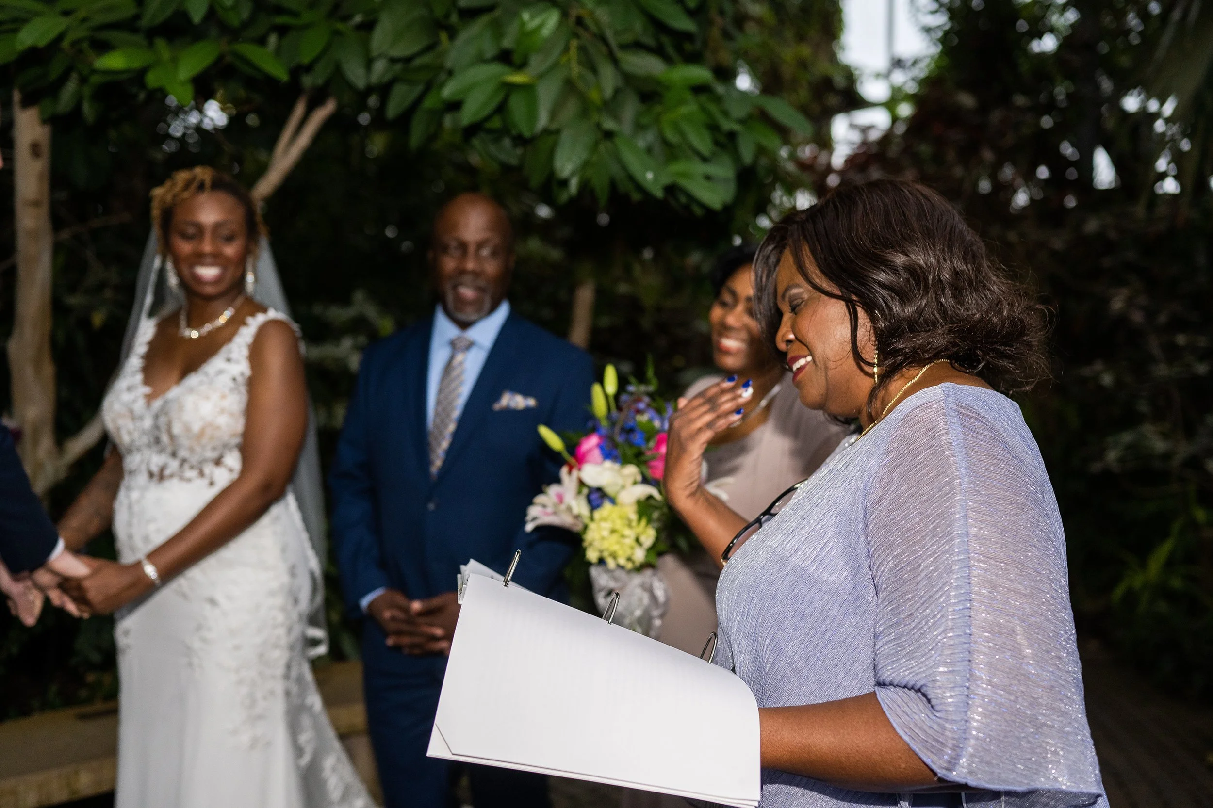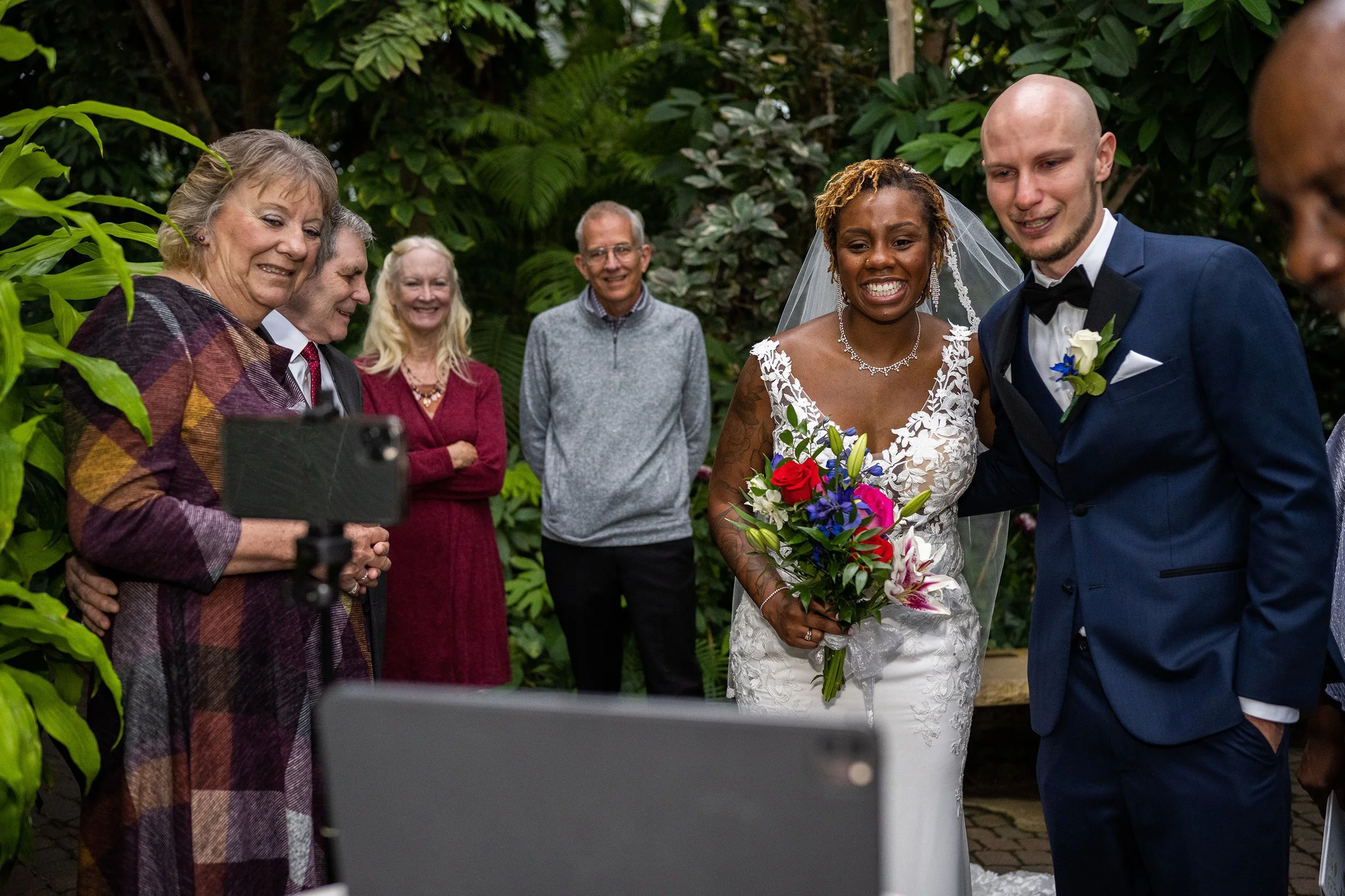 I was so excited when Mariama and Randall contacted me to photograph their small wedding in 2021. Now this was the second year of the pandemic, so folks were still having smaller weddings. This was to be an intimate ceremony with a few images afterwards inside the Frederik Meijer Gardens greenhouse. They had their parents surrounding them, their aunt officiating and a laptop set up so that family and friends who could not attend would be able to watch the wedding and chat afterwards.