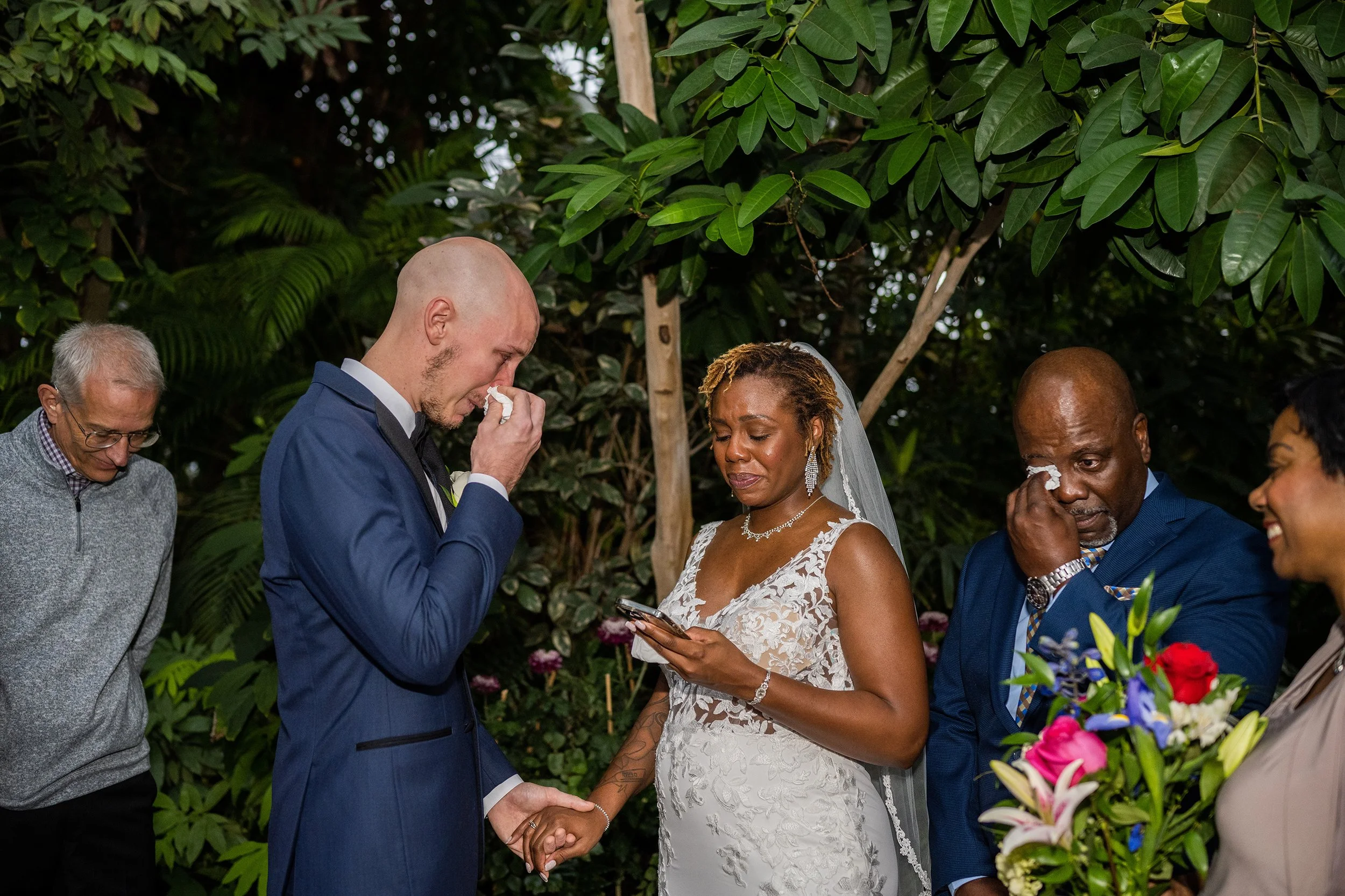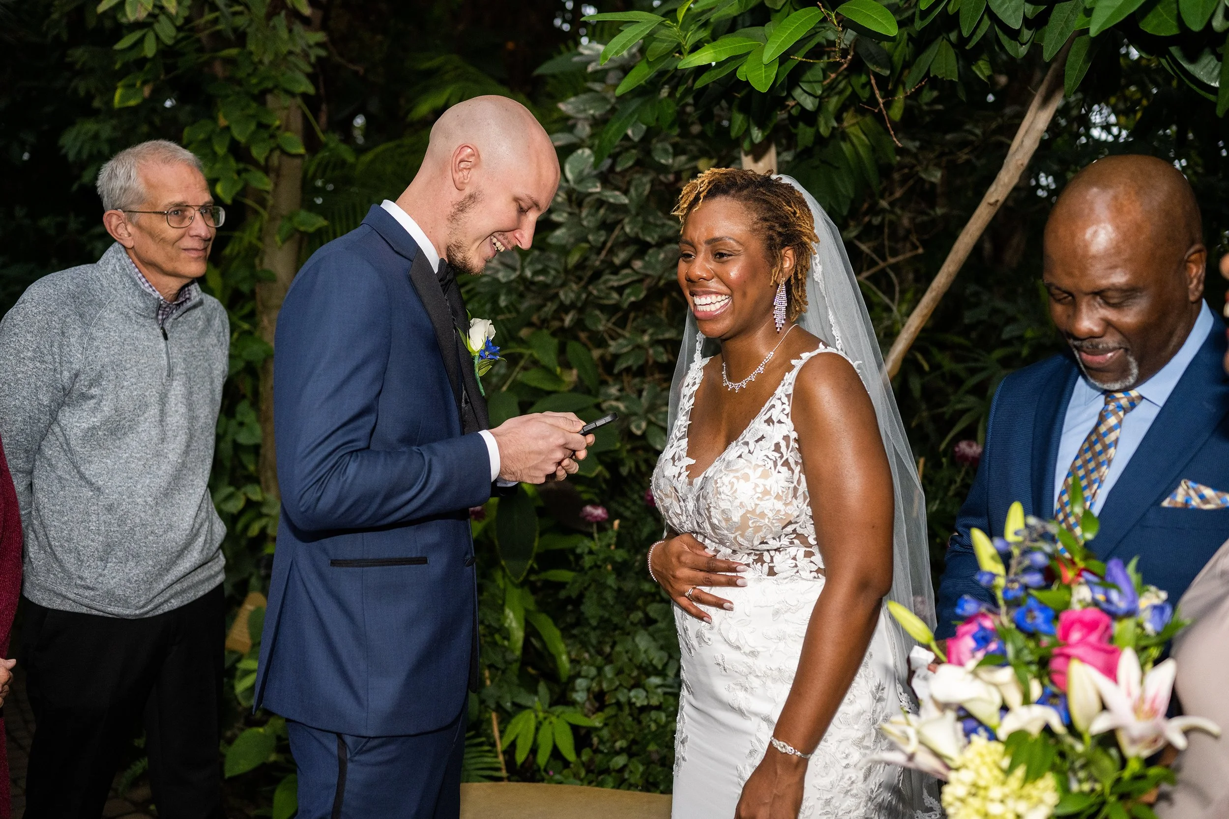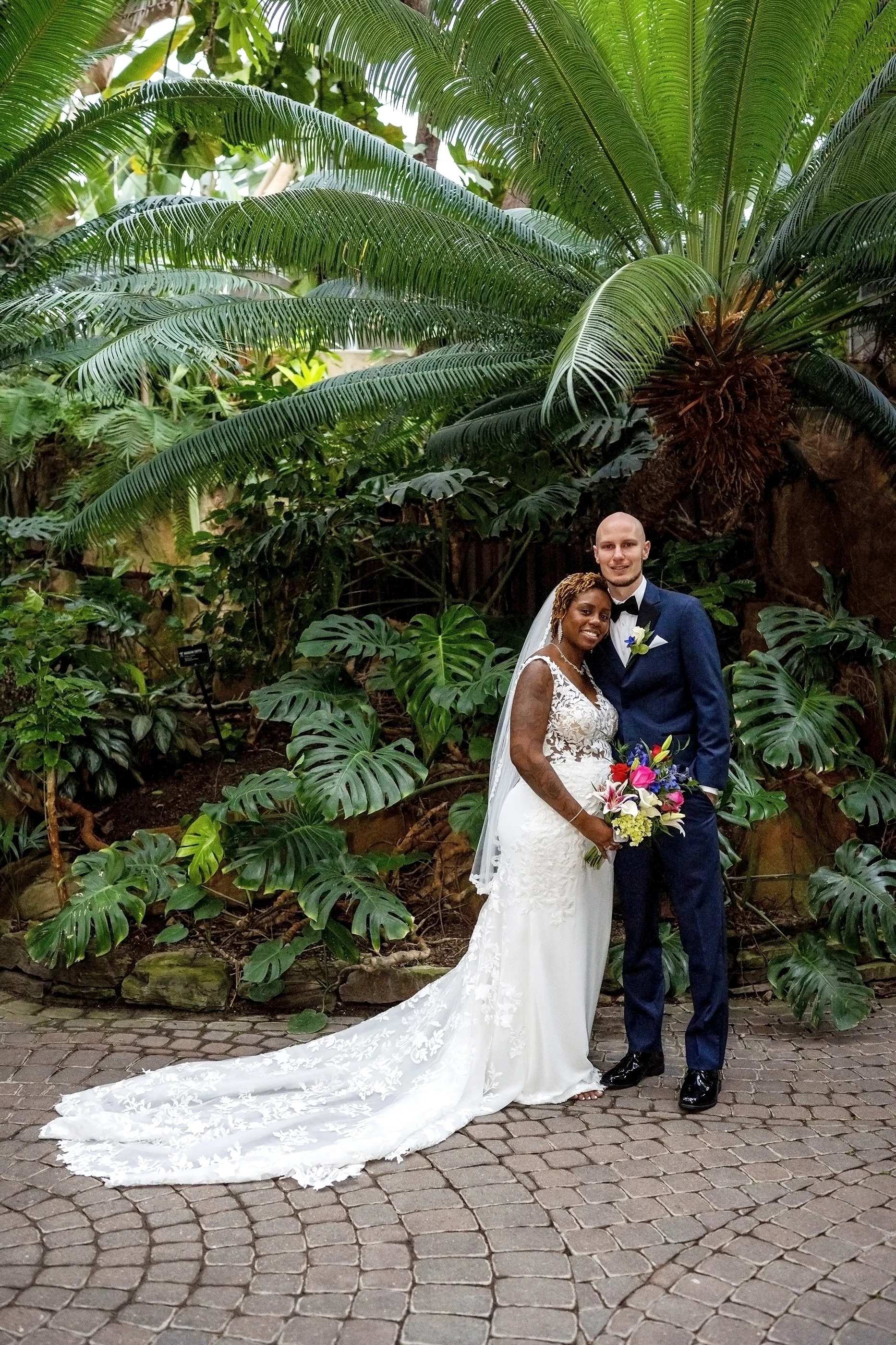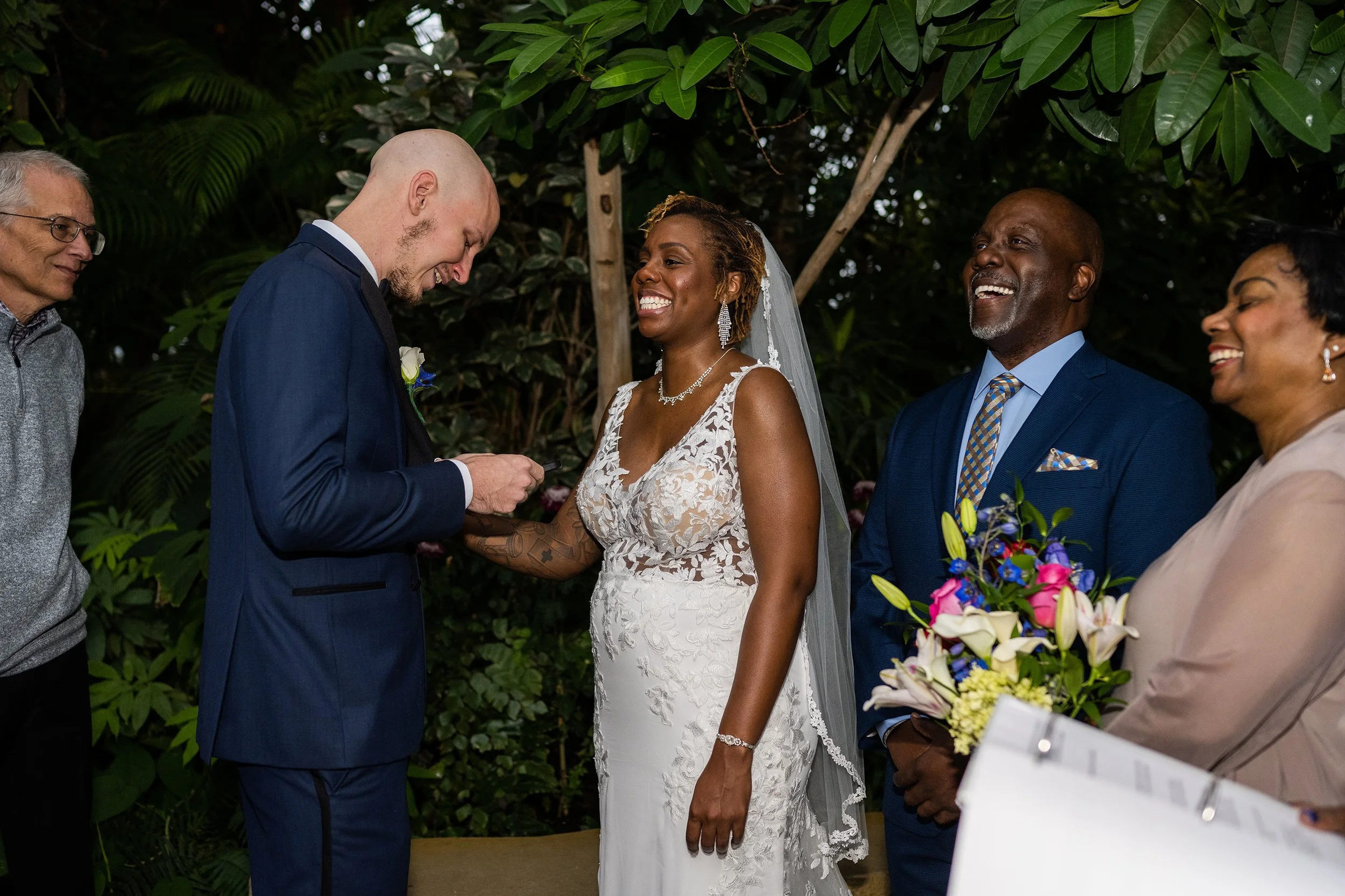 There were many tears and laughter during the vows. It was really sweet and lovely. The love these two have for each other was beautiful. After the ceremony was finished, along and some catching up with their remote loved ones, we did a few family photos, followed by couples portraits around the gorgeous tropical greenhouse. What a stunning setting to celebrate love and say “I do.” It was perfect.
